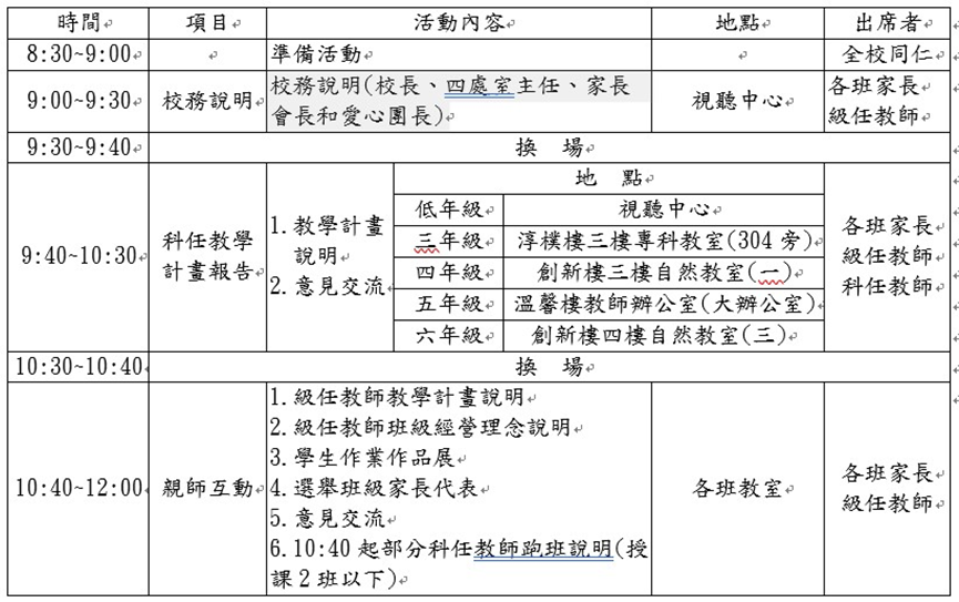 為了強化親師溝通的管道,本校將於9月16日( 六)上午9:00〜12:00舉行「學校日」活動。我們誠摯邀請您的參與,期盼透過良性的互動,提供老師及學校更具體有效的協助及意見。