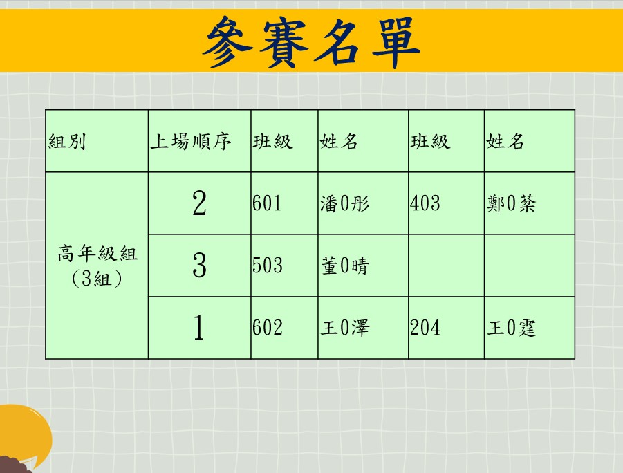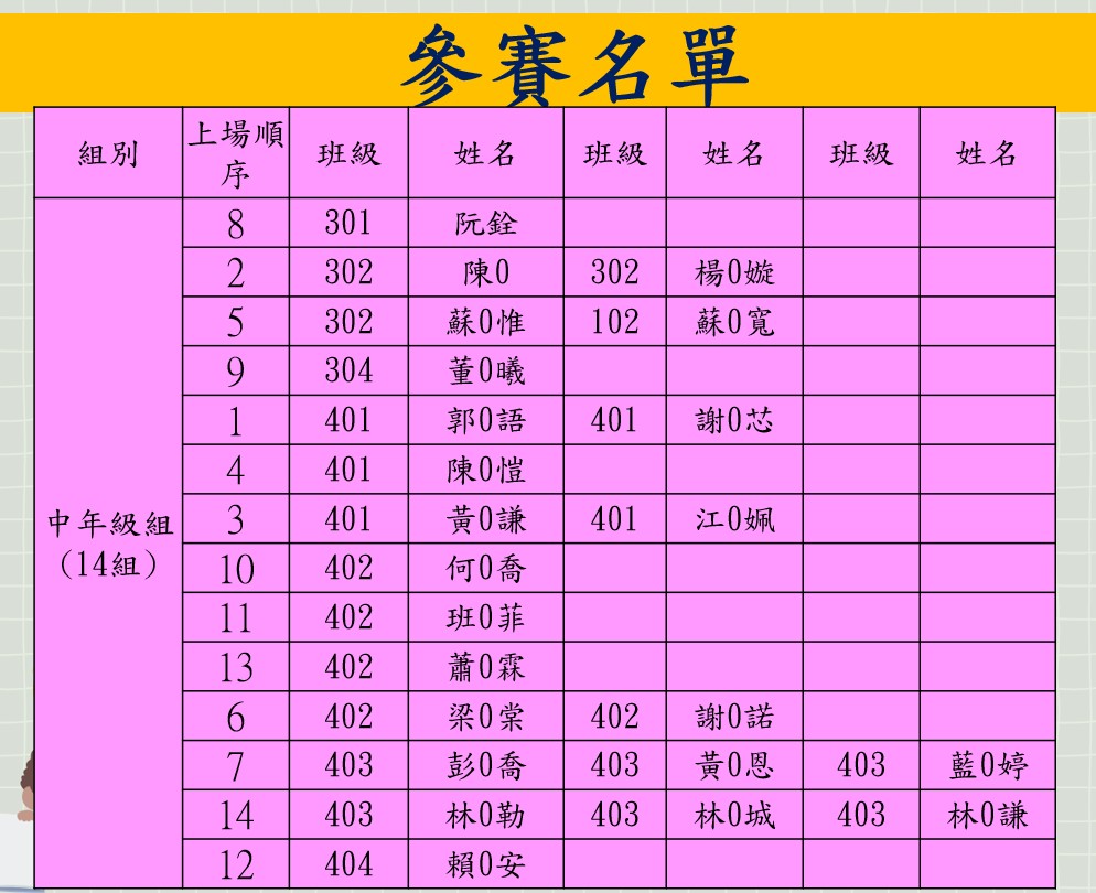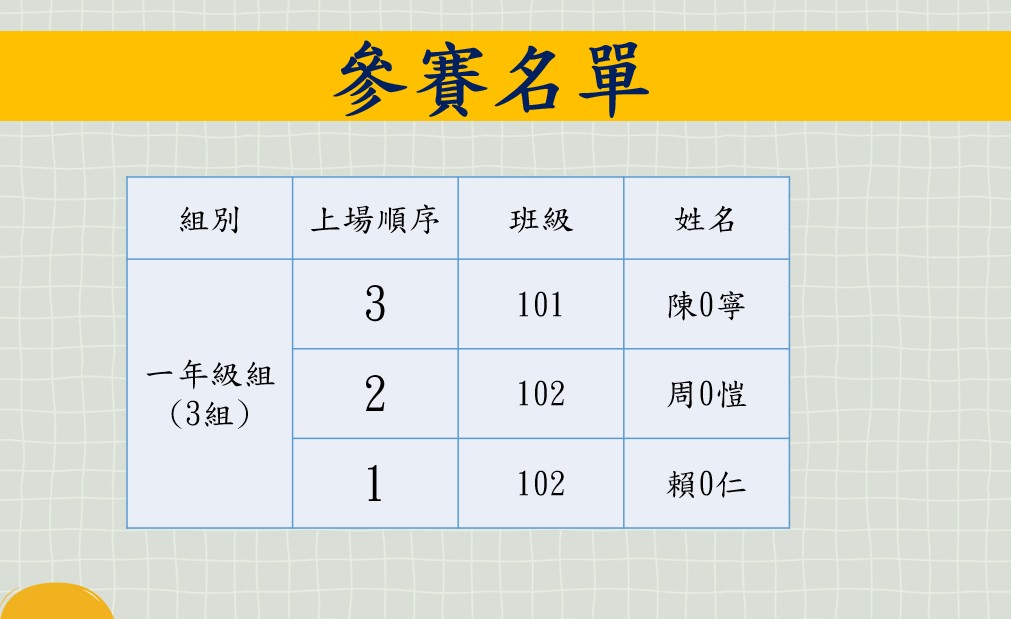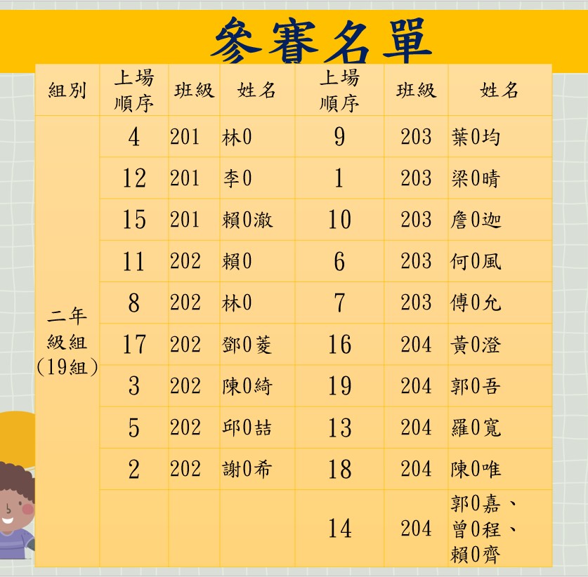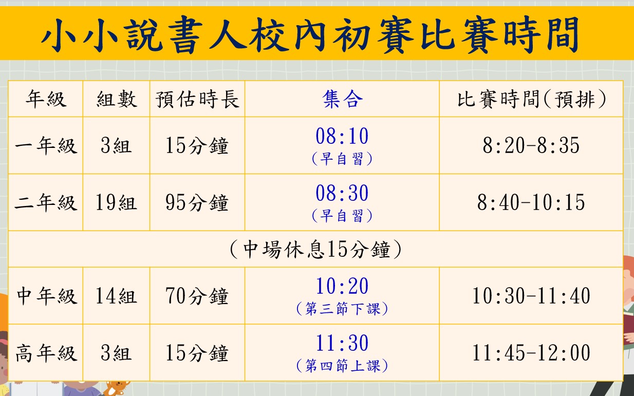 本校113年度校內小小說書人初賽比賽順序及賽程時間如下,請各位參賽選手參注意並準時於指定時間內集合