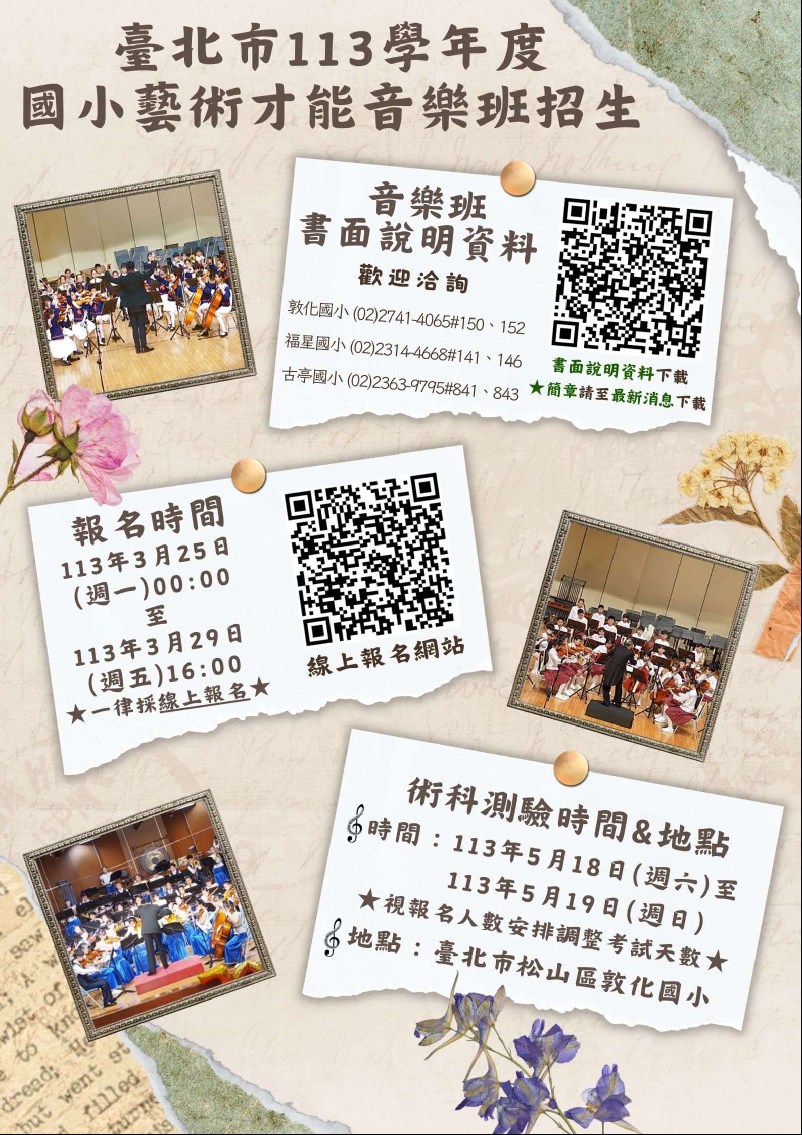 二、報名時間及方式:113年3月25日(星期一)00:00起至3月 29日(星期五)16:00止,於本市國中小藝才班鑑定報名 系統(https://tparttalent.tp.edu.tw)報名。 三、有關國小藝術才能音樂班招生鑑定或課程相關問題,敬請 洽詢以下學校: