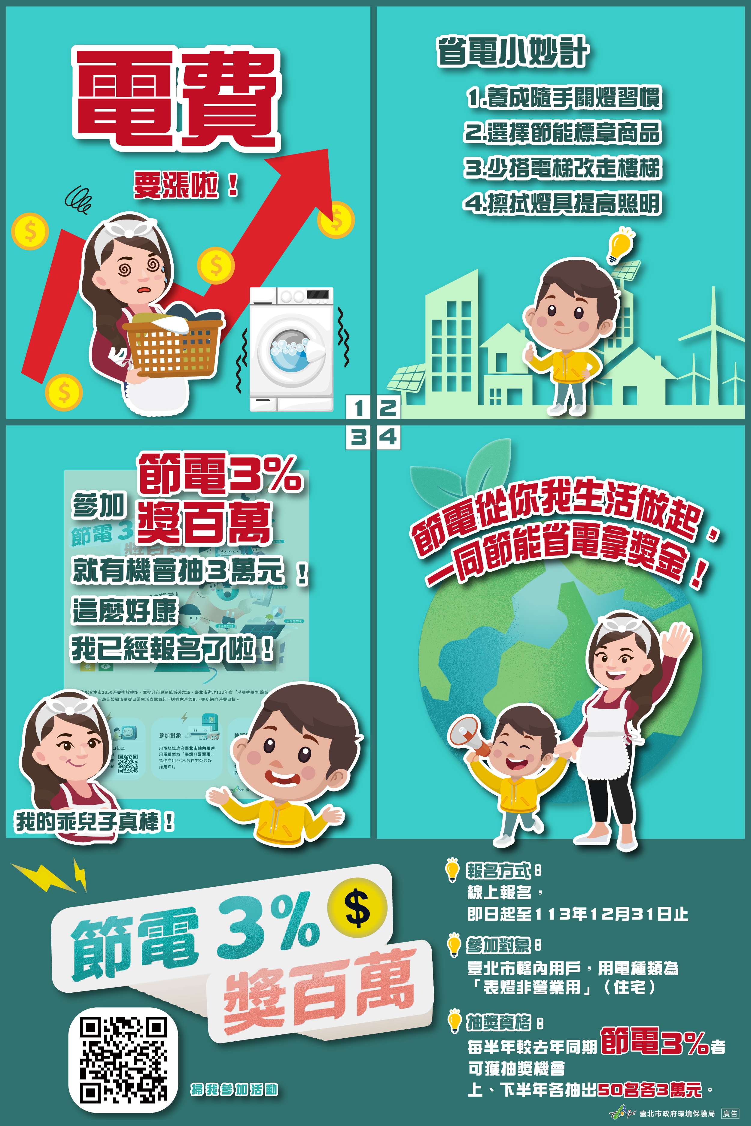 環境保護局「淨零拚轉型節電3%獎百萬」活動4格漫畫宣傳圖卡,詳情請參閱附件節電3%妙計宣傳4格漫畫海報。