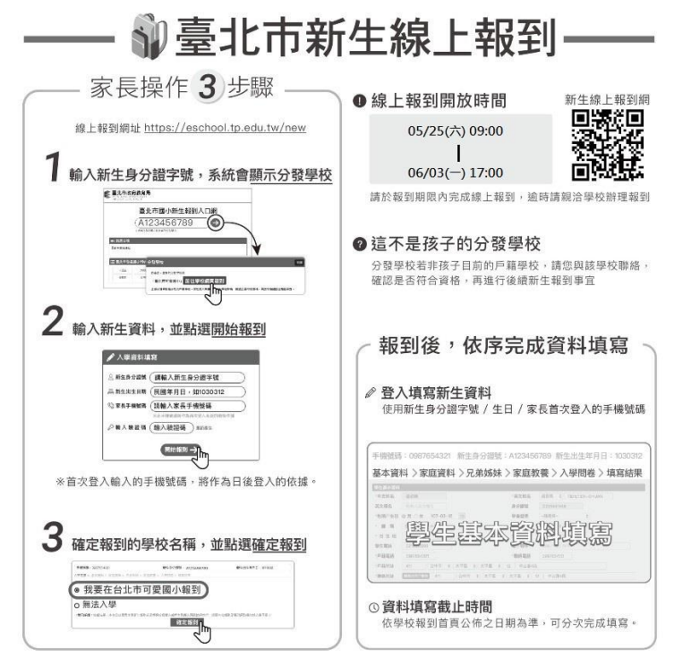 2.現場報到:如無法使用線上報到或戶籍異動者,請於113/5/25上午9時~12時持報到通知單、 小朋友的戶口名簿或戶籍謄本正本至<本校教務處註冊組>辦理報到,聯繫方式 02-27915870#250。
