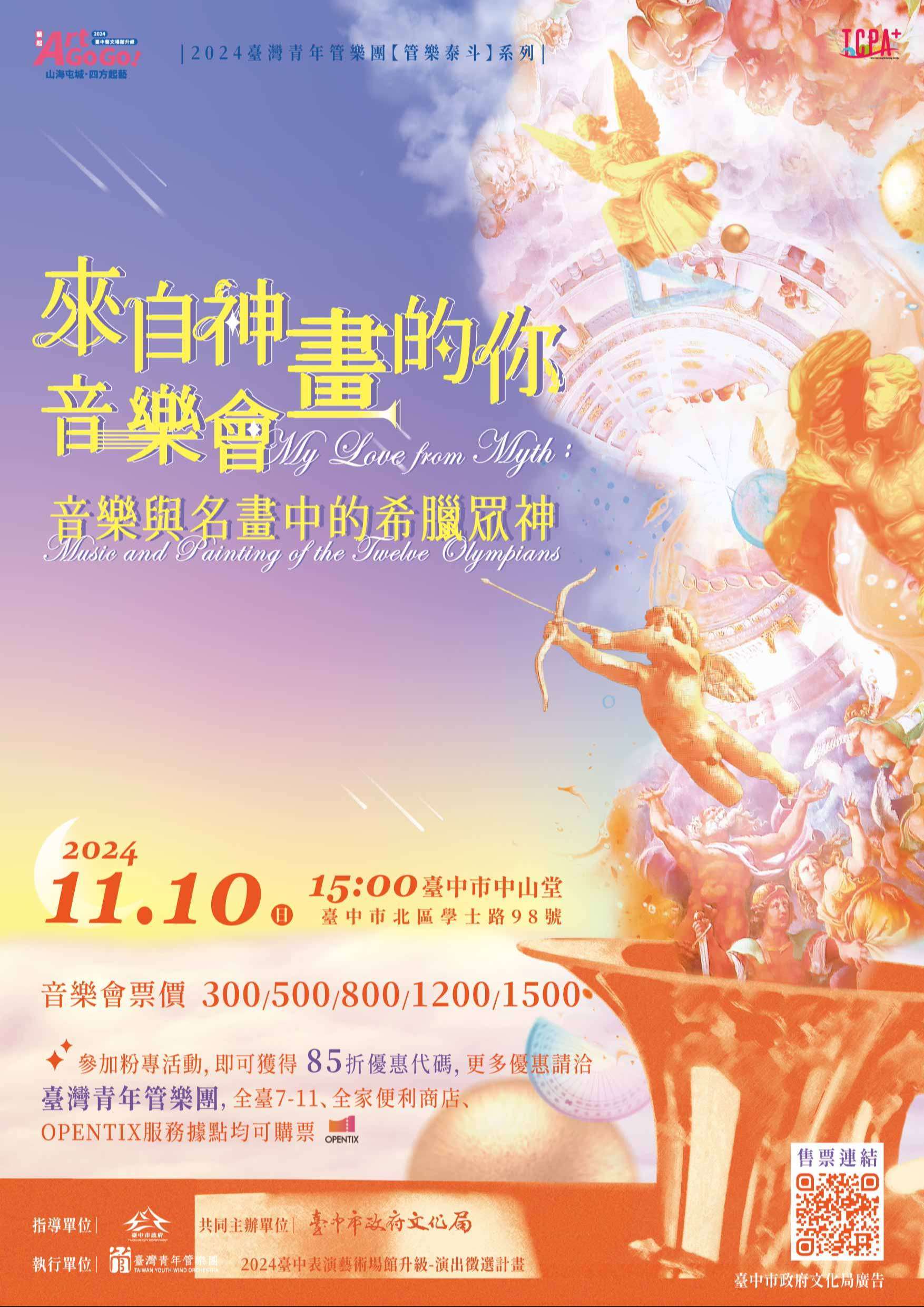 二、節目介紹:臺灣青年管樂團『管樂泰斗』系列音樂會, 2024隆重呈現【來自神畫的你】音樂會-音樂與名畫中的希 臘眾神,是一場融合希臘神話與西班牙作曲家奧斯卡·納瓦 羅的《奧林帕斯諸神》交響組曲的音樂會。十個樂章生動 描繪十二位神祗,以具挑戰性的曲目展現管樂團的卓越演 奏技巧;特邀Podcaster葵花子在樂章中介紹名畫,讓觀眾 更深入理解神話故事。音樂會還包含2024委託創作《甘露水音畫-永恆的剎那》交響管樂曲,致敬雕塑作品「甘露水」,誠摯邀請貴校全體師生加入 這場神話與藝術的音樂旅程,一同見證奇妙的永恆剎那。