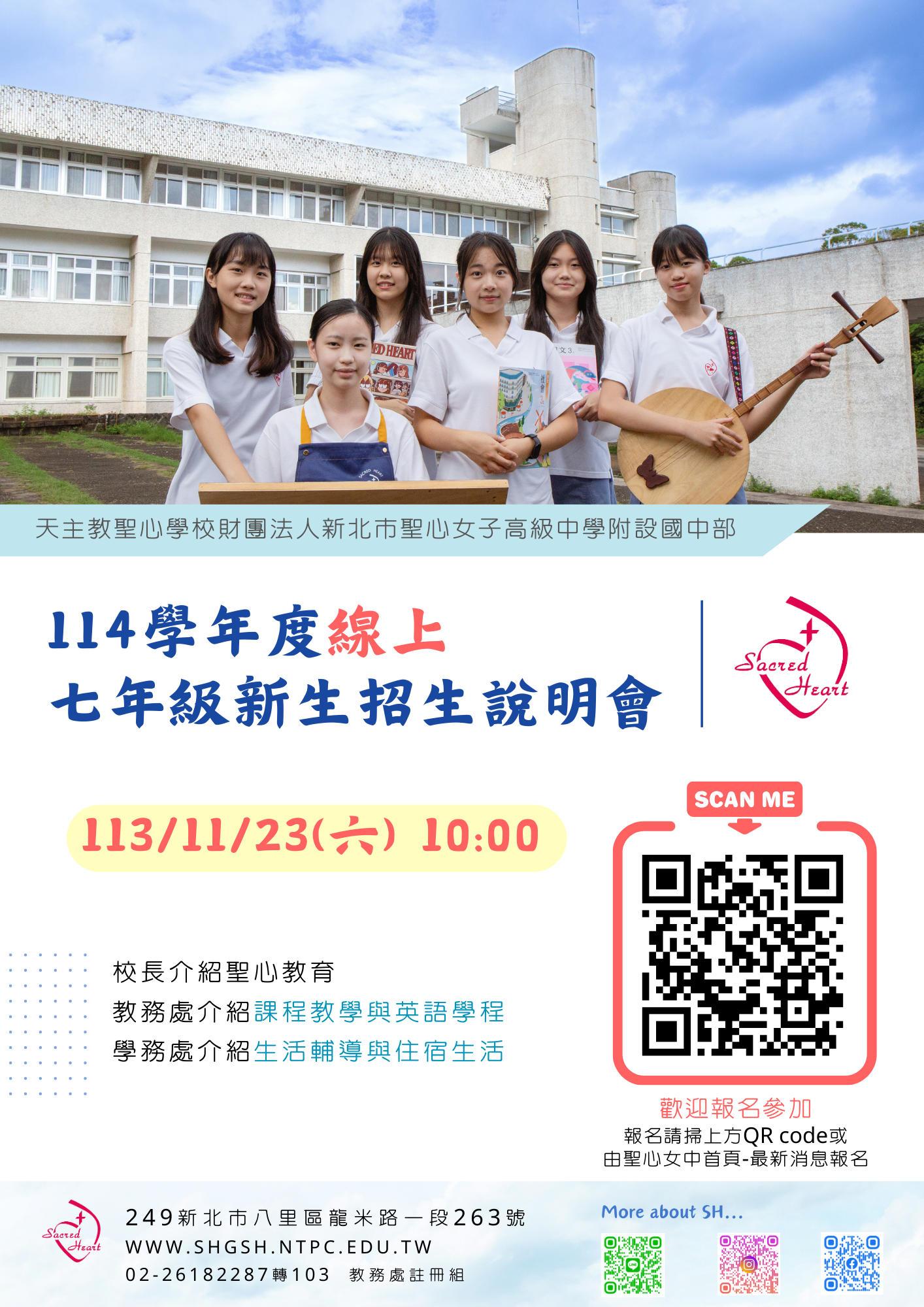 四、報名方式: (一) 報名表連結:https://forms.gle/yndGDFUGwGqdLzhF7 (二) 聖心女中首頁www.shgsh.ntpc.edu.tw—最新消息--114 學年度七年級新生線上招生說明會