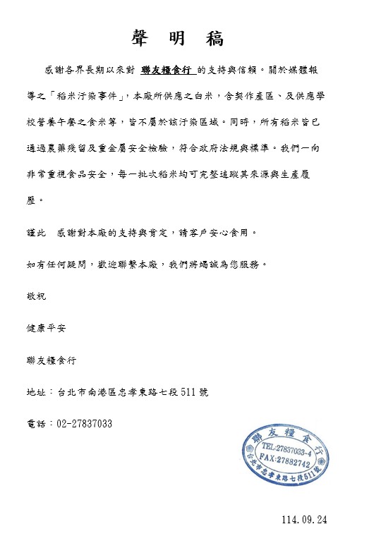1.本校營養午餐使用產銷履歷公糧米來源為「聯友糧食行」,檢附聯友糧食行聲明稿。