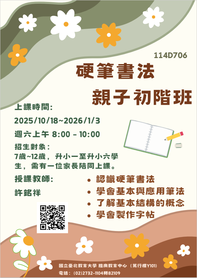 一、「114D706 硬筆書法親子初階班」課程時間為114年10月18 日至115年1月3日,每周六上午08:00 - 10:00,合計2小 時,12次。課程費用為每對親子(2人)9800元,材料費500 元,初次報名需繳交報名費300元,網頁https://cce. ntue.edu.tw/course/5868。