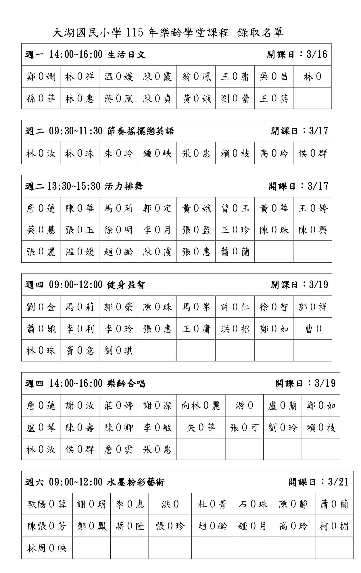 大湖國民小學115年樂齡學堂課程 錄取名單