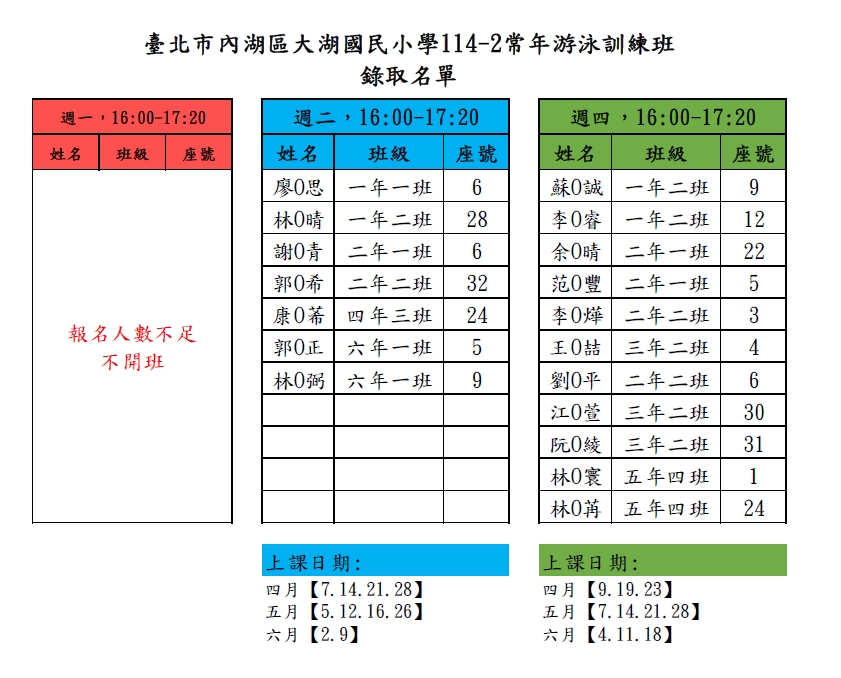 已報名週一常泳訓練班,可於3/24(二)10:00前來電,