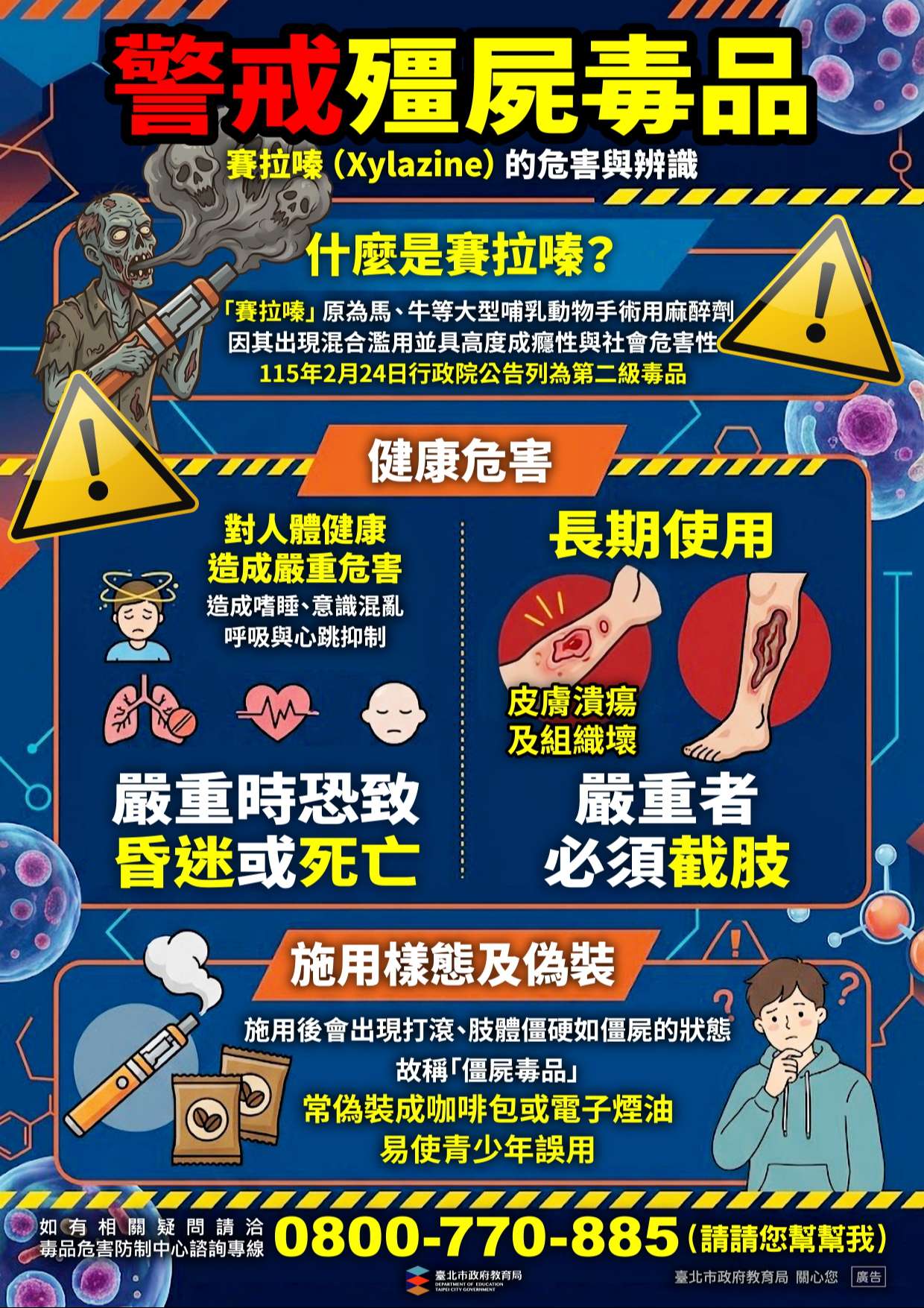 三、該毒品對人體危害極大。施用後可能出現步履蹣跚、呼吸 困難、方向感喪失等症狀,並伴隨視線模糊、過度嗜睡, 甚至昏迷等副作用;亦可能導致皮膚潰瘍,嚴重者需截 肢。若與其他毒品混合使用,死亡風險更高。此外,此類毒品常偽裝成咖啡包或電子煙油等產品,增加青少年誤用 的風險。
