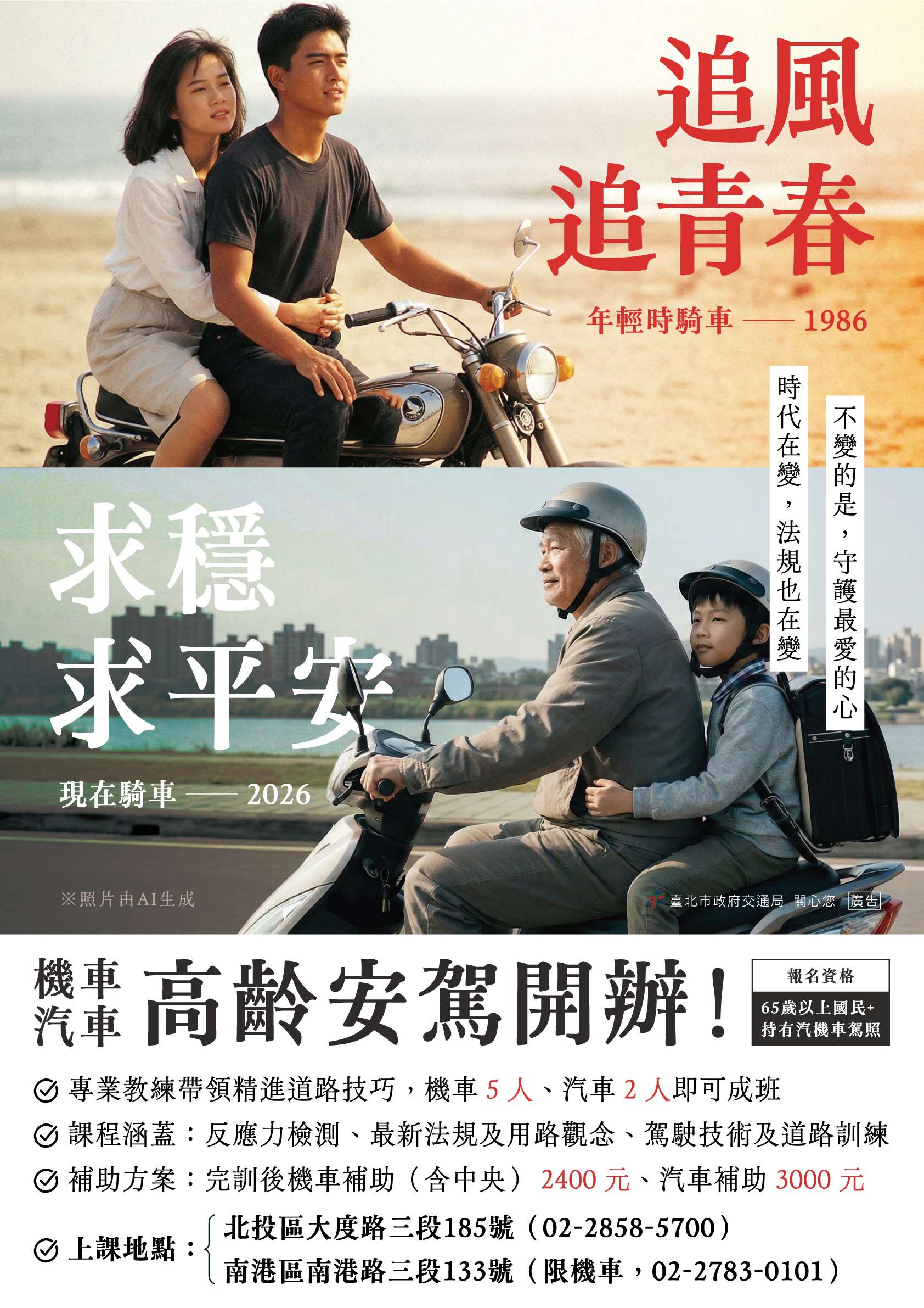 二、為提升高齡者交通安全意識及增進駕駛技能,本局推動高 齡汽機車駕訓補助措施,鼓勵高齡民眾參與道路駕駛訓練 課程,以降低交通事故風險。